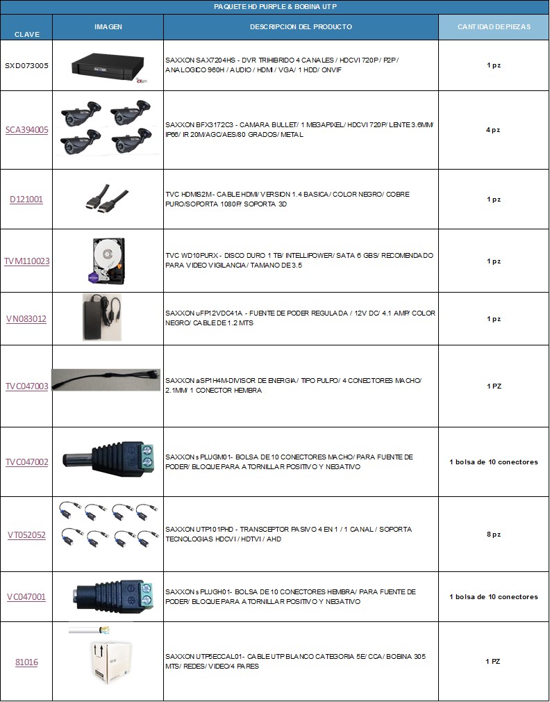 SAXXON SAX7204HS3KITWDPPaquete Kit de 4 canales trihíbrido y disco duro Purple WD 1TB/ 4 cámaras 720P/ energía/ cable.